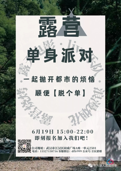本次活动有朋友圈转发抽奖活动,有机会赢取东方丽人高端相亲尊享私人定制服务一次/活动免费门票/mac口红/活动门票代金券等,关注公众号“东方丽人高端相亲”回复“野营抽奖”即可参与~